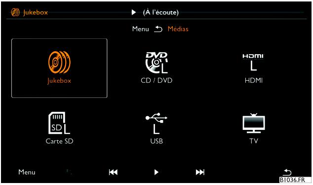 Toutes les sources multimédias s’affichent sur l’écran d’affichage. Si une source n’est pas disponible, elle s’affiche en gris.