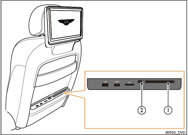 1. Appuyez sur la touche d’éjection (2) sur le dossier de siège voulu pour éjecter le disque. Le disque est alors partiellement éjecté.